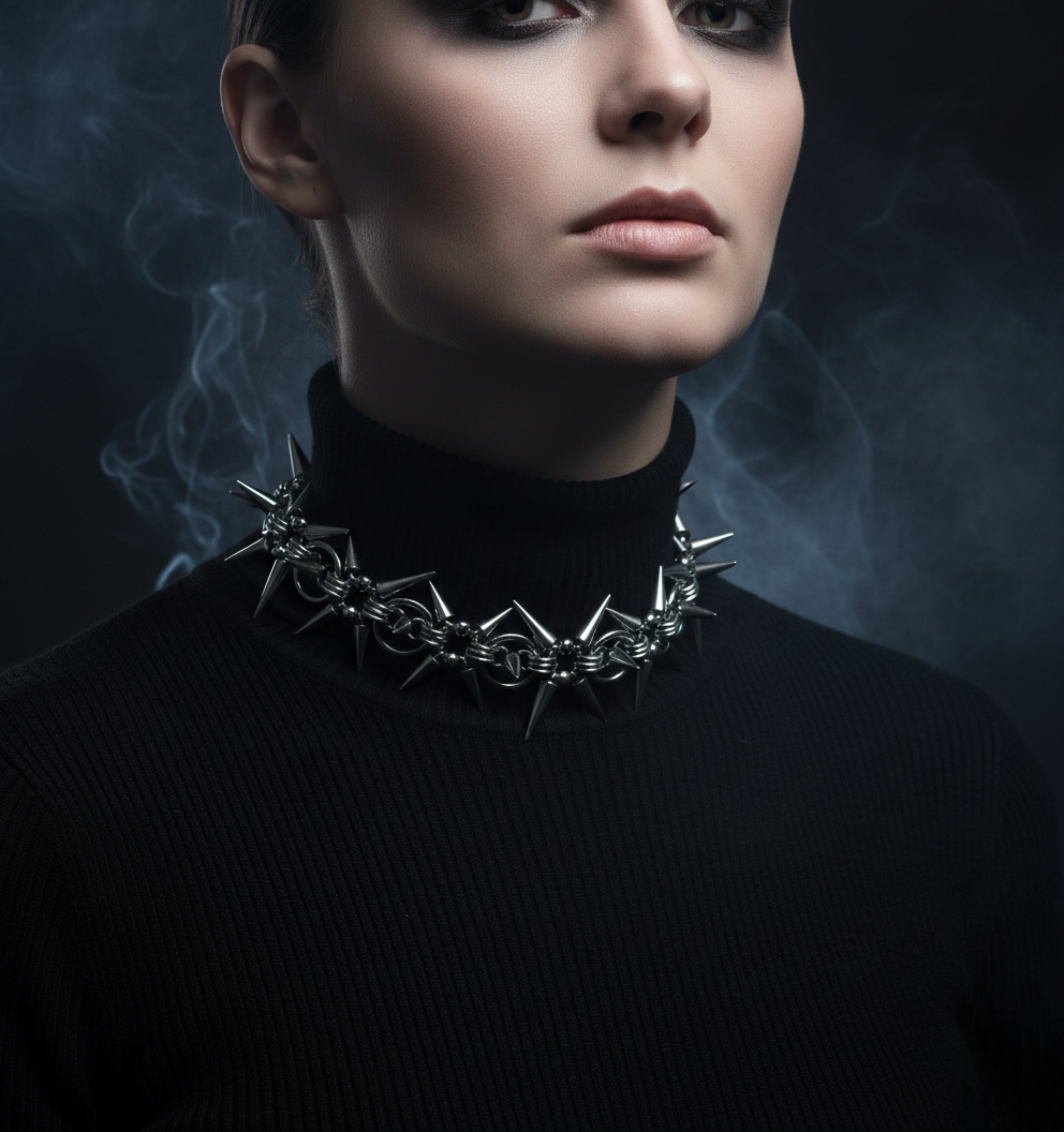 A spiked choker designed to command attention. Clean metal, bold form, and a presence that speaks without words.